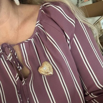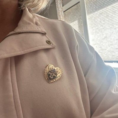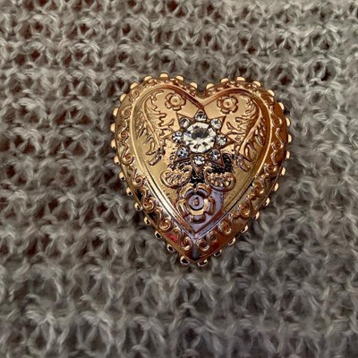 [This review was collected as part of a promotion.] I am loving the way this golden heart embossed brooch ads some modern vintage flair to an ordinary every day outfit. This roach is from the brand universal thread and is made of a lightweight gold. There is a clear stone in the middle with smaller stones on the outside and I love the way it has almost a vintage look to it like it really could be older than it actually is . I received an incentive to write this review.