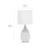 A charming and practical table lamp to meet your fashion lighting needs. This 14.17" lamp features an oval textured stucco ceramic base and a white fabric shade. Perfect for living room, bedroom, office, kids room, or college dorm! An easily accessible rotary switch is located on the 5' cord of the lamp for your convenience.