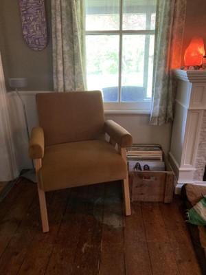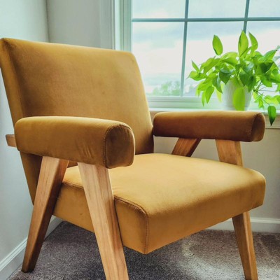 The Threshold upholstered arm accent chair in light brown velvet is an attractive, sturdy and comfortable piece of furniture. The only issue I have is that a couple of the bolt holes didn’t line up. That may have been due to my error, but the assembly instructions were pretty straightforward. The light wood legs, soft caramel velvet fabric and simple design will allow this chair to either blend in to your decor or stand out depending on how you style it.