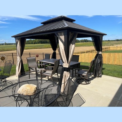PURPLE LEAF 10' X 12' Outdoor Hardtop Gazebo for Patio Galvanized Steel Double Roof Teak Finish Coated Aluminum Frame Pavilion Gazebo with Netting