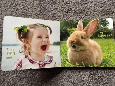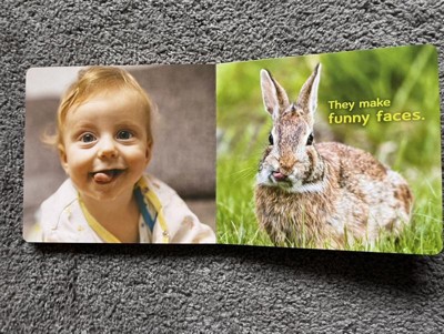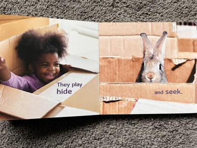 Lots of things babies do, bunnies do too! See babies and bunnies nap, cuddle, jump, and play, in full-color photographs.
