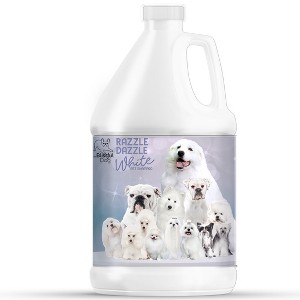 - GENTLE WHITENING SHAMPOO - Razzle Dazzle White Shampoo reduces tear and facial stains, rids pee and poo stains and brightens white coats while containing no bleach.