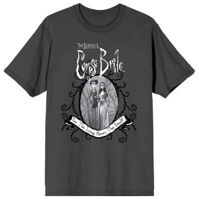 Fans of Tim Burton and The Corpse Bride are sure to love this women's graphic t-shirt! The big, colorful movie poster image has been professionally printed and applied so it will last long enough to get you through any adventure life (or the after-life) throws your way. Made of 100% preshrunk cotton, this navy blue The Corpse Bride fan apparel features short sleeves for comfort and style in any weather. It can be machine washed with like colors, then tumble dried for easy care. As an officially licensed product, the movie poster characters and title logo t-shirt makes a great gift for any fan of Tim Burton and The Corpse Bride!