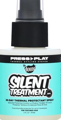 The Doux Silent Hair Treatment 30-Day Humidity Shield - 2 fl oz - Silent Treatment 30Day Thermal Protectant Spray from The Press Play Thermal Styling System is a heat activated humidity shield that is infused with Keratin and a naturally derived strand coating technology that protects hair from frizz for up to 4 shampoos. This thermal protectant spray features Hydrolyzed Corn Starch, Keratin, and Humectant.