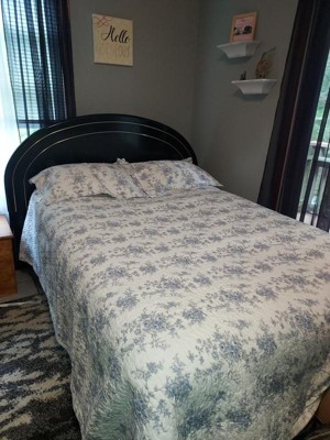 [This review was collected as part of a promotion.] This English Garden inspired quilt looks so pretty on our bed. The soft blue floral pattern on white background really brightens up our bedroom. I purchased sheer white curtain panels for the windows to tie the whole look together and I am very happy with the light and tranquil overall look of our bedroom. The quilt is a soft cotton fabric and can be machine washed and dried.