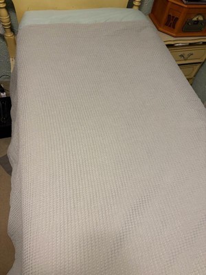 [This review was collected as part of a promotion.] This is a large waffle blanket made for a queen/ full bed and fits over the entire bed. I like the design of the waffle but the material as not as comfortable as I expected. It is thin and is not a soft/snuggle blanket but more a blanket to go over a comforter. Seems like good quality though