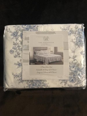 [This review was collected as part of a promotion.] The Farmhouse by Rachel Ashwell British Rose Queen 4 Piece Sheet Set has a very pretty pattern of blues roses with gray leaves and stems. The fitted sheet fits well and it comes with two pillowcases. I wish it came with four.