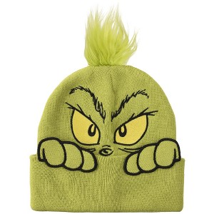 Bring some holiday mischief to your winter wardrobe with this Grinch cuff beanie. Designed to resemble the iconic character, it features peekaboo hand appliques above the cuff and a green faux fur pom that mimics his tuft of hair. Made with acrylic knit materials, it provides warmth and durability. This beanie is one size fits most. Hand wash it in cold water and lay it flat to dry for easy care.