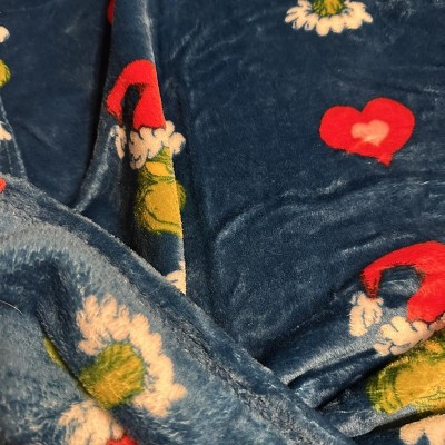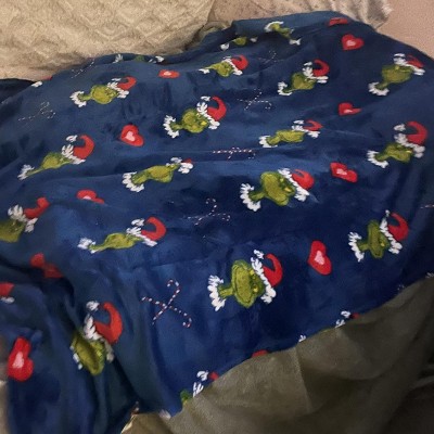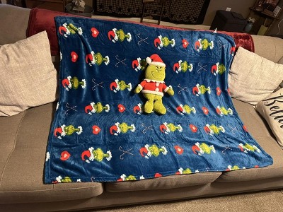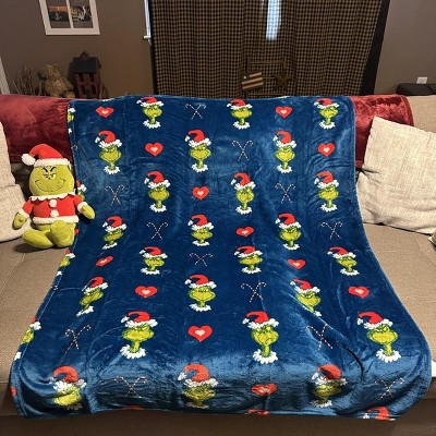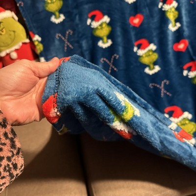 - Cozy Throw: Plush throw features a playful Grinch design with candy canes, hearts, and festive details on a deep blue background.