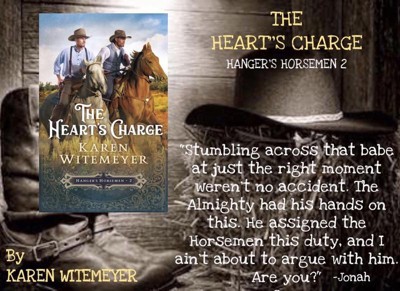 So Good! I seriously didn’t expect the plot twist. I highly encourage the reading of The Heart’s Charge by Karen Witemeyer. The story was so good and the intense scenes had my heart racing. On many occasions I felt encouraged by the words of wisdom and scripture woven through this book. I loved how the book is mainly told through the point of view of the Hanger’s Horsemen. I also really enjoyed how Karen Witemeyer included children in this story. Mark Wallace and Jonah Brooks are two of the Hanger’s Horsemen. They find themselves at the front door of the Harmony House. It’s here that they are introduced to Katherine Palmer and Eliza Southerland. Old sparks are set aflame between Mark and Kate as they see each other for the first time in ten years. Mark decides the Harmony House could use some repairs before he makes his way back home. Jonah agrees they should stay but for a different reason — on mission. I loved the involvement of the children in the mission. And Abner’s big rescue!!! I love how Rawley cares for all the railroad children. As a nanny and an Auntie, I saw a little bit of myself in both Katherine and Eliza and their love for the children in their care.