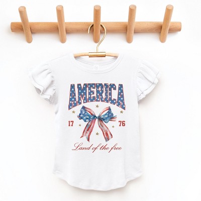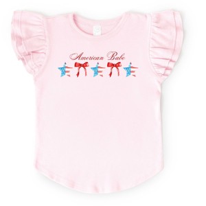 Celebrate your American pride with this stunning design featuring a beautiful babe surrounded by stars and a stylish bow. The vintage-inspired coquette aesthetic adds a touch of glamour to any outfit. Perfect for those who want to showcase their patriotic spirit in a classic and feminine way. Whether you're heading to a Fourth of July parade or just want to add a bit of flair to your wardrobe, this American Babe Star Bow Coquette design is sure to turn heads and make a statement. Dress your little one in the cutest Flutter Sleeve Toddler Tee! Featuring fun and bright colors, this adorable graphic tee is perfect for little girls. Made with high-quality materials, it's the perfect addition to any stylish wardrobe.