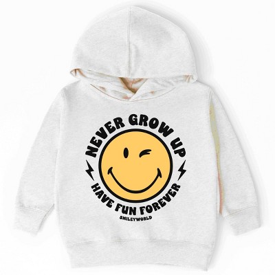 Embrace the carefree and youthful spirit with our 'SmileyWorld Never Grow Up' print. This design features a cheerful smiley face, reminding you to stay positive and playful at heart. Perfect for those who want to spread some positivity and joy wherever they go. Let this design serve as a daily reminder to always embrace your inner child and never lose that sense of wonder and excitement. With its dynamic and fun appeal, this print is sure to bring a smile to your face and those around you. Keep your little one warm and stylish with our high-quality toddler graphic hoodie. Made from soft and durable material, this cozy hoodie features fun designs that are both trendy and comfortable. Perfect for everyday wear or playtime adventures.