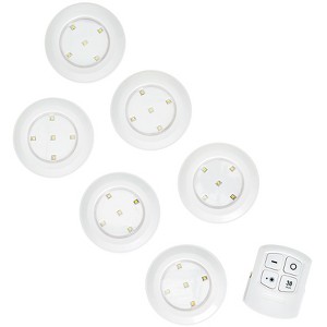 6-Pc. Wireless Lighting set is a easy, convenient way to add extra light to any area. It is ideal for stairs, under cabinets, closets, drawers, children's rooms and more. Simply stick a light wherever you need it. Then, turn it on by tapping the center or using the wireless remote. The remote also lets you adjust the brightness of the LED lights or set a 30-minute timer. Made from: Plastic Set includes: Remote, 2-3/8"W x 3"L5 Lights, 3-1/2" dia x 1"H, each Notes: Remote requires 2 "AAA" batteries, not includedEach light requires 3 "AAA" batteries, not included