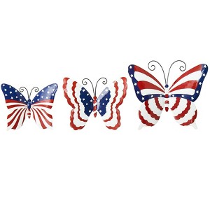 Bring the beauty of nature to any setting with Butterfly Trio Wall Art. Eye-catching value includes 3 different-size butterflies, each with a hidden hook for easy installation. Group them together or scatter them throughout a room to create a charming theme. Made of: Metal Set includes: -Large, 10"W x 10"L -Medium, 8"W x 8"L -Small 7"W x 7"L