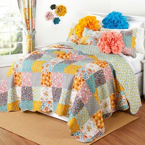 An easy way to enhance your farmhouse décor is by adding decorative pillows to your bed or couch. This 16x16 throw pillow features a patchwork design of vibrant floral prints. For 2 looks in 1, the reversible pillow has a light blue ground with all-over tiny yellow flowers. Order several of these throw pillows to carry the patchwork design all around your home. 16" sq. Polyester with polyfill. Machine care.