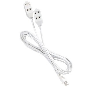 This split extension cord turns one outlet into six. It features two separate cords that branch out from the main plug. Each end has three outlets, two on one side and one on the other. This white double ended extension cord lets you take advantage of an outlet behind a couch or bed so you can have lamps on each side. The dual extension cord is also a great tool for indoor Christmas decorations. Plastic. 5 ft. 8 in. long overall. UL-Listed