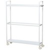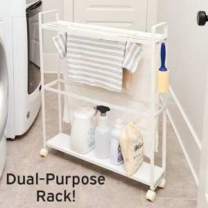 Slim Dual Laundry Storage and Drying Rack can fit between your washer and dryer to make use of a tight space. Fill the lower shelf with dryer sheets, detergent pods and other laundry needs. The 3 rods across the top create a drying rack for towels and delicates. Features easy-roll wheels. Use it in the kitchen or living room, too. Made of: Metal Measurements: 26-1/3"W x 6"D x 33-1/3"H Notes: Some assembly required; assembly hardware included