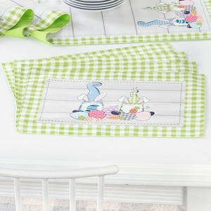 Add a festive touch with an Easter Table Runner or Set of 4 Placemats. Each piece is bordered in a light green buffalo check pattern. The center has a shiplap look. The ends of the runner and the center of each placemat feature gnomes dressed as bunnies surrounded by Easter eggs. Made from: