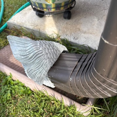 - This downspout cover is not just decorative, but also functional. It helps to direct rainwater away from your home's foundation, reducing the risk of water damage. The open mouth of the fish acts as a spout, guiding the water flow in a controlled manner.