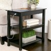 Keep a convenient source of power right next to you with a Functional End Table with Power Outlets. In addition to 2 shelves, it features a power station with 2 USB ports and 2 electrical outlets. Made from: MDF Measurements: 23-1/2”W x 11-3/4”D x 22"H Cord, 116”L Notes: 2 USB charging ports 2 Electrical outlets Assembly required; assembly hardware included