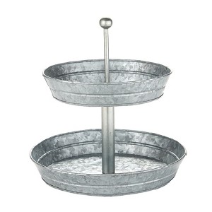 Set out appetizers, desserts and more on this Galvanized Serving Tray. The 2-Tier Serving Tray and 3-Tier Serving Tray have graduated levels to create an organized, appealing display. The Caddy has a large section for plates or napkins, 3 small sections for utensils and a wood handle for carrying. Also makes useful storage for your craft supplies.