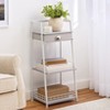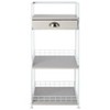 The Ladder Shelf with Drawer is your new go-to for stylish storage solutions. This chic piece combines form and function, featuring 3 versatile shelves and a handy drawer, all finished in a modern gray and white color scheme. The top shelf doubles as a drawer, perfect for stashing away small essentials. Meanwhile, the middle and bottom shelves boast grate-style walls, ensuring items stay in place and look great too. Plus, the ladder frame at the back and sides provides extra support for taller items, making this shelf a reliable choice for any room. Designed to fit seamlessly into both compact and spacious areas, it's not just a shelf'it's a statement piece that adds a touch of elegance and practicality to your home decor. Made of: Iron, MDF and polypropylene Measurements: 14-1/2"W x 11-1/2"D x 31-1/2"H Notes: Assembly required; assembly hardware included