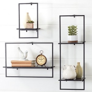 Contemporary-style wall shelf extends out from the frame for a 3-D look. Use this floating shelf to display collectibles, framed photos and other decoration items. This display shelf can also be used to hold potted plants or books. Assembly required; assembly hardware included. 8"W x 10"D x 13-3/4"H. MDF and metal.