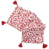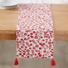 Add a pop of color to your dining area with this Red Floral Runner. Each piece features bright/dark pink embroidered flowers on a natural ground. The runner has a tassel at each corner. Made from: