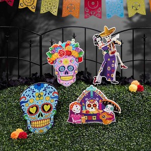 A Set of 4 Holiday Stakes is the colorful touch your yard needs. Covered with vibrant artwork, these easy-to-install decorations are sure to get attention. Made of: Plastic Set includes: -Dancing couple, 8-7/8"W x 19-1/2"H -3 Skulls 14-1/2"W x 11"H -Blue skull 11-1/4"W x 15-7/8"H -Pink skull, 12"W x 14-1/4"H Notes: Easy assembly required
