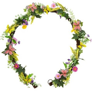 Summertime Butterfly Collection brings nature's blooming color into your home. Each piece is crafted with vibrant simulated flowers. Lifelike butterflies appear to flit among the blooms. Switch on the warm LEDs to create a welcoming look for a wall, door, mantel or tablescape. Made of: Polyester, PVC and rattan Measurements: Garland, 72"L Wreath, 18" dia. Notes: Requires 3 "AAA" batteries; not included