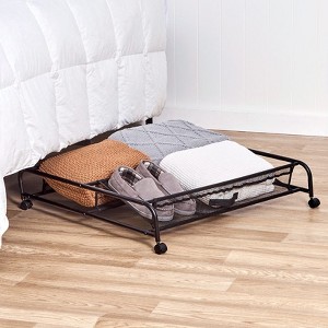 Organize your room with the easy convenience of our Underbed Storage with Wheels. It provides perfect storage for shoes, bags, accessories and more. The wheels easily roll back and forth, eliminating the need to slide around heavy boxes. Made of: Metal and polyester Measurements: 23-1/3"W x 24-1/2"D x 6-1/2"H