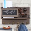 Wall-Mounted Organizer is a handsome option to add storage to any room. With a classic wood finish, it features not only 6 hooks but a shelf and a bin to hold mail or even small decor accents. A small chalkboard provides a spot to leave notes and messages with the included 6 pieces of chalk in a variety of colors. Position it near the front door to keep your essentials handy. Made of: MDF and metal Measurements: 15-3/4"W x 5-3/4"D x 10"H Chalkboard, 7-1/2"W x 3-1/2"L Notes: Some assembly required; assembly hardware included Includes 6 pieces of chalk