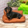 Fits my old Chihuahua perfectly. It's easy for him to get into. If he rolls out, he just uses it as a pillow. It does seem to be waterproof (he's old & """"leaks""""). I just blotted liquid up. Lousy color (rust).