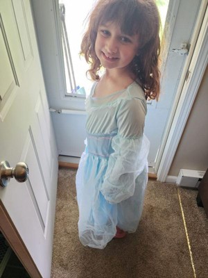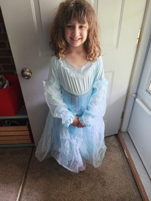 [This review was collected as part of a promotion.] It's a little too big for my daughter! But very pretty! Looks like the dress from the movie! She loved it and she agreed the color was pretty 😍 she said it was itchy so you may want to wear something under it!