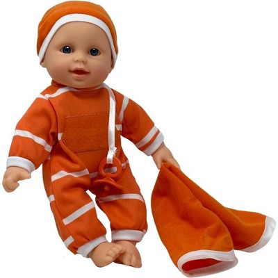 Dolly, is cuddly soft, precious and sure to be played with for years. Your little one will be captivated. Dressed in a onesie and a sweet little cap, this doll is made for love. Made for toddlers 18 months and up, a perfect first doll. The head, hands, and feet are made of durable vinyl. Made by the New York Doll Collection offering a modern selection of 18" Dolls, Clothing, Furniture and Accessories.