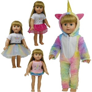 Calling all Unicorn Lovers...This adorable 4 pc unicorn doll clothing set It is a thoughtful and exciting gift, that mothers and grandmothers can gift their child or grandchild. Great Christmas gift or Birthday Gift. Every Girl loves Unicorns and now their favorite doll can also dress up as one. This set also includes a UNICORN ONESIE so your doll can even be a unicorn in her dreams. surprise this special kid in your life with a gift she will cherish for generations. fits most 18-inch dolls including American girl dolls.