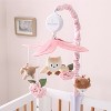 Little Forest Musical Mobile by The Peanutshell helps to promote baby's auditory development, motor skills and visual stimulation. Our expertly designed nursery essential features soft velour deer, fox, and owl characters, surrounded by felt flowers under a canopy of pink leaves. The digital music box plays snippets of 12 different lullabies to soothe your little one gently to sleep. Easily switch music on/off or between songs with the simple touch of a button. Two velour arm covers in white and light pink are provided for a polished designer look. This item coordinates perfectly with our Fairytale Forest 3 Piece Crib Set. Requires two AA batteries that are not included.