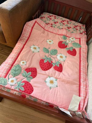 [This review was collected as part of a promotion.] This is a nice quality strawberry blossom set for a nursery. The material is soft and looks well made. It fits my crib that also convert to a toddler bed. I will say the blanket is suited for more of a baby blanket vs a toddler blanket. I don’t think it will properly cover my 21 month old. The color is vibrant and a little more red/peachy than I expected according to the stock photo. I was thinking it would be a light pink. Overall I think it is a nice set and would recommend if buying for your nursery.