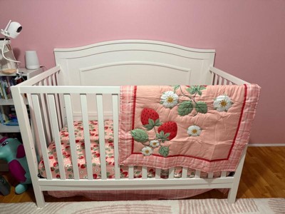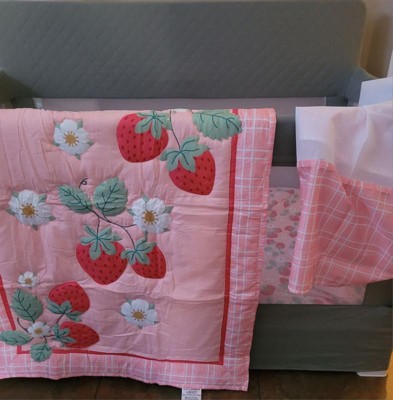 [This review was collected as part of a promotion.] Beautiful crib bedding set for baby girls with a sweet strawberry design in soft pink tones. Includes a quilt, fitted sheet, and crib skirt. Made with soft, comfortable, and durable materials that are easy to wash and perfect for nursery décor. It arrives very well packed. It looks very good quality.