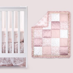 The Grace 4-Piece Crib Set by The Peanutshell is a collection that brings together every nursery essential. The set includes an elegant patchwork quilt, bow print fitted sheet, changing pad cover and a layered dust ruffle. The quilt showcases a pretty patchwork of fabrics in dusty pinks with a golden trim. Each square has a unique feel with an embroidered dot, moire taffeta, crinkle satin and a sweet overlay with a ribbon textured floral pattern. The dust ruffle is a double layer of rich fabrics with a sheer netting resting atop a panel of moire taffeta. The netting has delicate motifs created by tulle ribbons and crewel-work inspired embroidery to create a soft floral design. The collection features rich, dusty pinks in an assortment of luxe fabrics -- cotton sateen, moire taffeta and crinkled and embroidered satin. The perfect sweet and sophisticated start for any baby girl's nursery.