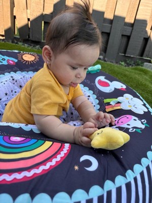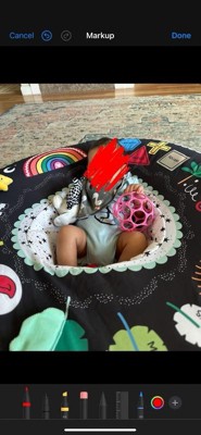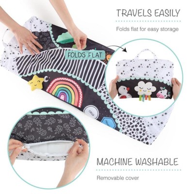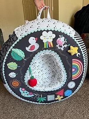 [This review was collected as part of a promotion.] So so very cute. East to take of and wash when needed, easy to deflate and pack away. I love the color choices as babies see black and white for those first moments so it can grow and learn with this comfy toy. Flip it over for a cute background and soft space to lay with ease.