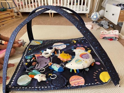 The 7-in-1 Space Play Gym by The Peanutshell will have baby reaching for the stars. This versatile activity center is designed to captivate and engage your little one with a cosmic array of sounds, shapes, and textures. Featuring enchanting outer space-themed artwork with a thoughtful selection of interactive features including a mirror, plush toys, rattle, crinkle, bell, fidget ribbons, and a tummy time pillow. This engaging activity mat supports motor skills, sensory exploration, and cognitive development from tummy time to sitting up. It's foldable design makes it travel-friendly and space-saving, while the soft, machine-washable fabric ensures simple maintenance. A non-skid backing ensures it stays in place for endless hours of play.