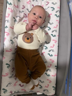The Wilderlust Woodland Animals 23-Piece layette set by The Peanutshell is a breath of fresh air for baby's closet. This bear-y adorable collection offers a whole forest of newborn essentials crafted in the softest, gentlest fabrics. The assortment includes 4 short sleeved and 3 long sleeve bodysuits, 1 sleep sack, 5 beanies, 3 pairs of scratch prevention mittens, 3 burp cloths, and 4 receiving blankets. An allover character print of woodsy friends in green, brown, and earthy tones is paired with a charming tan icon check for dozens of mix and match outfit combos