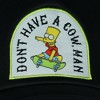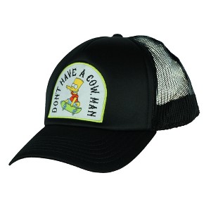 - Bart Design: This black trucker cap features an embroidered patch of Bart Simpson with his famous catchphrase, “Don’t Have A Cow Man,” boldly displayed on the crown
