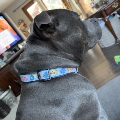 I love this collar. It is adorable and very well made. Machine washes well, I hang to dry. It is so hard to find cute collars especially for male puppies/dogs. Worthy Dog has so many cute collars, they are a little more expensive than others but it seems to be really well made and have not noticed any fading or wear. I will definitely be buying more, there are so many cute ones to choose from. My puppy is 8 months old, but he has a huge neck so he is wearing a L.