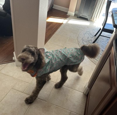 What an Adorable Raincoat! SO well made too! Nice & long & generous fitting. I ordered size M for my 8 lb Papillon. Although she is small her Body is long so I have never found a Raincoat to fit her, but this one does, beautifully! Great quality material, has an adjustable head piece attached & a small pocket, great for Treats or Bags. This is why I always come back to Target. GREAT Value, Quality & Price!!