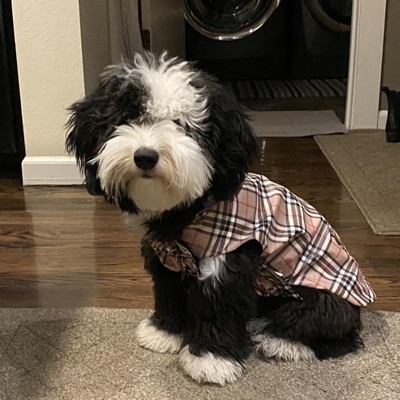 Super cute plaid print & unless I’m mistaken, it’s reversible to a black & white check pattern! There’s a little pocket on the back of the plaid side & reflective piping. I have 6 month old mini sheepadoodle puppy & the Medium fit well. I like that there’s elastic on the belly area straps to help make for a secure fit. My puppy is about 16lbs now but still growing so I may need to get another one for her to grow in to! She’s not a huge fan of clothing but once she’s had something on for a bit, she’ll hopefully get used to it. There’s an attached hood too! We live in the Pacific Northwest with lots of rain, so this will be a great option to have for the soggy days!