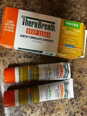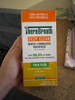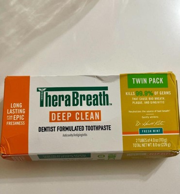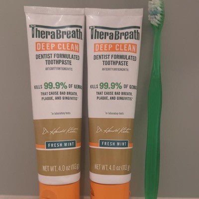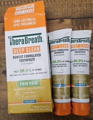 - A pack of two 4 oz TheraBreath Deep Clean Toothpaste; Fresh Mint flavor is long-lasting for epic freshness