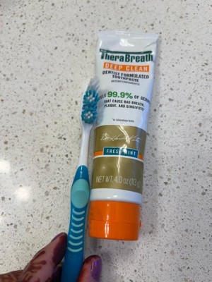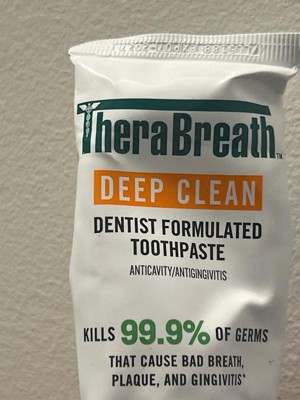 Take control of your oral health with TheraBreath Deep Clean Toothpaste. This dentist-formulated toothpaste kills 99.9% of germs that cause bad breath, plaque, and gingivitis (1) and fights bad breath . Stannous fluoride makes this toothpaste a two-in-one antigingivitis and anticavity sensation that helps prevent cavities, reduce plaque buildup, and helps prevent gingivitis for a healthy smile. This toothpaste has a Fresh Mint flavor, and is crafted to deliver whole-mouth freshness without the burn. Its refreshing blend of peppermint, plus subtle notes of sweet Italian lemon, eucalyptus, and Egyptian basil delivers a fresh and clean experience. Plus, it gently whitens even sensitive teeth while being kind to enamel with no harsh abrasives. (1) In laboratory tests.