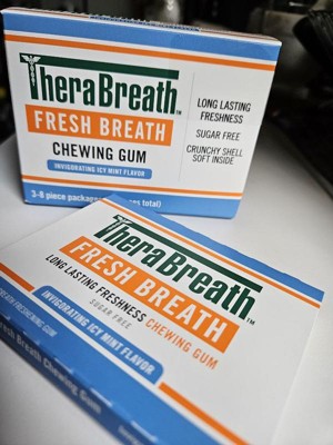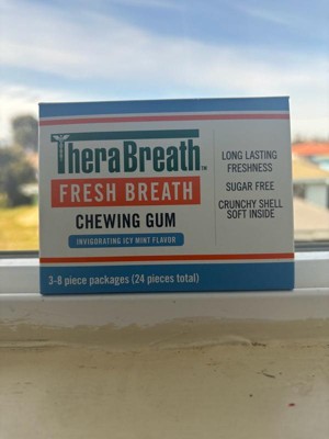 - Three packs of TheraBreath Fresh Breath Chewing Gum, Invigorating Icy Mint Flavor with eight pieces each (twenty-four pieces total)